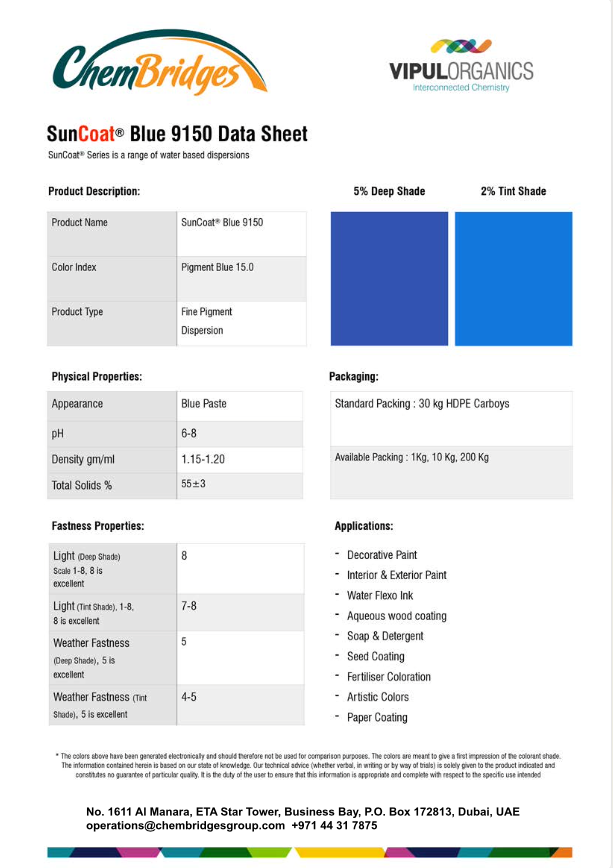SunCoat Blue pigments are high-performance, water-based dispersions known for their vibrant color, stability, and durability across coatings, inks, and industrial applications. SunCoat Blue 9150, formulated with Pigment Blue 15.0, delivers excellent lightfastness, weather resistance, and high solid content (55±3%), making it ideal for paints, coatings, and artistic applications. At Chembridges Group, we provide premium pigments for long-lasting color and performance.
